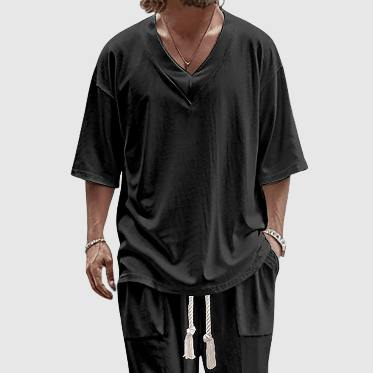Tento pánský set přináší nový rozměr pohodlí a uvolněnému stylu. Díky plynulému a modernímu designu je tento set ideální pro klidné dny, cestování nebo prostě pro relaxaci, aniž byste ztratili svůj osobní styl. Jeho volný střih přináší svěžest a volnost a podtrhuje váš moderní a bezstarostný životní styl.